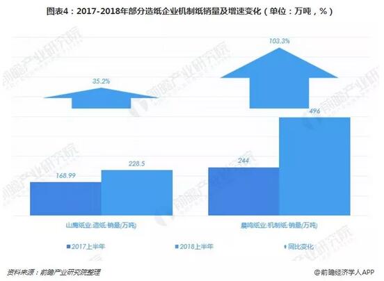 在環保政策的持續影響下,我國龍頭造紙企業優勢愈發凸顯,龍頭企業產銷狀況整體較好。從我國主要造紙企業的產量和銷量變化情況來看,2018年上半年美利紙業、山鷹紙業、岳陽紙業的機制紙產量均得到了不同幅度的上升,晨鳴紙業的產量略有下滑。而山鷹紙業和晨鳴紙業2018上半年的銷量分別較上年同期增長了35.2%和103.3%。