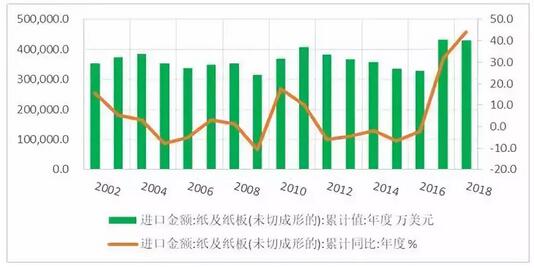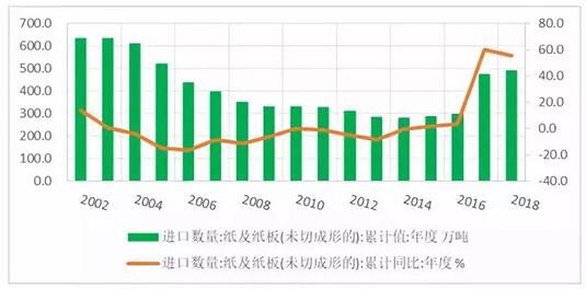 2014年-2017年中國紙及紙板進(jìn)口量增長,2017年中國紙及紙板進(jìn)口量為475萬噸,同比增長60%。2018年1-9月中國紙及紙板進(jìn)口量為490萬噸,同比增長55.4%。 圖1:國內(nèi)紙及紙板進(jìn)口(數(shù)量)情況: