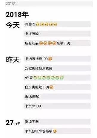 12月2日起,黃紙價(jià)格下調(diào)50元/噸。A級(jí)紙1950、B級(jí)紙1900、C級(jí)紙1850、D級(jí)紙1750、混合邊角料1950、坑紙1550、混合白廢紙2150、工廠(二白)小花2320、頁(yè)子紙2350(元/噸)。 12月1日起,本期價(jià)格不變。A級(jí)紙2000、B級(jí)紙1950、C級(jí)紙1900、D級(jí)紙1800、坑紙1600、混合白廢紙2150、工廠(二白)小花2320、頁(yè)子紙2350(元/噸)。 江蘇太倉(cāng)玖龍紙業(yè): 12月1日起,12月1-3日國(guó)廢停收三天。A級(jí)停收、B級(jí)停收、C級(jí)停收、D級(jí)停收、坑紙停收、混合純白紙停收、頁(yè)子紙停收、工廠小花停收、書(shū)本紙停收、混花停收(元/噸)。 河北永新玖龍紙業(yè): 12月1日起,箱板紙下調(diào)50元/噸,白廢下調(diào)50-100元/噸。箱板AA級(jí)1900、邊角料1850、A級(jí)1850、B級(jí)1800、C級(jí)1750、統(tǒng)貨1650、B級(jí)頁(yè)子紙1990、帶書(shū)皮切頁(yè)子紙1940、混合白紙1610、大花統(tǒng)貨1510(元/噸)。 遼寧沈陽(yáng)玖龍紙業(yè): 12月1日起,白廢價(jià)格下調(diào)50元/噸。包裝廠A1920、超市紙B1880、C綜合紙1820、D統(tǒng)包1650、廢雜紙990、頁(yè)子紙2020、辦公廢紙2020、小花1820、混合白廢紙1770、書(shū)本廢紙1820、書(shū)本統(tǒng)貨1770、大花1720(元/噸)。 江蘇常熟理文紙業(yè): 12月2日起,一級(jí)紙、大統(tǒng)紙、統(tǒng)貨下調(diào)40元/噸。一級(jí)紙2010、大統(tǒng)紙1930、統(tǒng)紙1780、一級(jí)辦公室紙2400、頁(yè)子紙A2350、頁(yè)子紙B2250、二白小花2200、小花2100(元/噸)。 福建漳州山鷹紙業(yè): 12月3日起,廢紙價(jià)格調(diào)整。AA級(jí)2000、A級(jí)1920、B級(jí)1820、C級(jí)1670(元/噸)。 安徽兆隆紙業(yè): 12月3日起,廢紙價(jià)格下調(diào)30-50元/噸。AA級(jí)(甲牛)2350、A1級(jí)1830、A2級(jí)1770、A3級(jí)1710、B1級(jí)1650、B2級(jí)1590、B3級(jí)1500、C級(jí)(農(nóng)村統(tǒng)貨、灰板)1400、一級(jí)彩管(化纖管)1530、二級(jí)彩管(彈絲管)1440、普管1330、寶塔管1210(元/噸)。 12月2日起,廢紙價(jià)格下調(diào)30元/噸。AA級(jí)(甲牛)2380、A1級(jí)1860、A2級(jí)1800、A3級(jí)1740、B1級(jí)1680、B2級(jí)1620、B3級(jí)1530、C級(jí)(農(nóng)村統(tǒng)貨、灰板)1450、一級(jí)彩管(化纖管)1580、二級(jí)彩管(彈絲管)1490、普管1360、寶塔管1220(元/噸)。 山東棗莊豐源中科紙業(yè): 12月3日起,廢紙價(jià)格下調(diào)50元/噸。AA級(jí)1950、A級(jí)1850(元/噸)。 山東泰安泰和紙業(yè): 12月2日起,B級(jí)、C級(jí)紙箱下調(diào)50元/噸,B級(jí)C級(jí)白紙邊下調(diào)100元/噸。A級(jí)紙箱2000、B級(jí)紙箱1850、C級(jí)紙箱1750、紙箱邊2000、紙管類1570、頁(yè)子紙(I類廢紙)2450、頁(yè)子紙(II類廢紙)2350、頁(yè)子紙(III類廢紙)2230、書(shū)本(去皮廢紙)2160、書(shū)本(帶皮廢紙)2160、混合廢紙(A級(jí))2160、混合廢紙(B級(jí))2060、混合廢紙(C級(jí))1960、純銅版廢紙1860、B級(jí)白紙邊3100、C級(jí)白紙邊3030、E級(jí)白紙邊2310(元/噸)。 山東濰坊匯勝紙業(yè): 12月2日起,AA級(jí)下調(diào)50元/噸,AB級(jí)下調(diào)40元/噸,C級(jí)下調(diào)30元/噸。外地AA級(jí)1890、外地A級(jí)1870、外地B級(jí)1840、外地C級(jí)1700、內(nèi)地AA級(jí)1880、內(nèi)地A級(jí)1860、內(nèi)地B級(jí)1830、內(nèi)地C級(jí)1690(元/噸)。 12月1日起,廢紙價(jià)格下調(diào)30元/噸,C級(jí)不變。外地AA級(jí)1940、外地A級(jí)1910、外地B級(jí)1880、外地C級(jí)1730、內(nèi)地AA級(jí)1930、內(nèi)地A級(jí)1900、內(nèi)地B級(jí)1870、內(nèi)地C級(jí)1720(元/噸)。 山東淄博仁豐紙業(yè): 12月1日起,廢紙價(jià)格下調(diào)30元/噸。A級(jí)1910、B級(jí)1810(元/噸)。 浙江臺(tái)州森林紙業(yè): 12月1日起,化纖管、辦公廢紙下調(diào)100元/噸。掛面紙2120、A級(jí)黃板2080、超市紙2050、普通黃板紙1960、化纖管1560、甲牛2450-2550、辦公廢紙低白1810、辦公廢紙高白2000(元/噸)。 江蘇徐州中興(建平)紙業(yè): 12月2日起,廢紙價(jià)格下調(diào)20元/噸。電器廠紙1990、A級(jí)純清板紙1940、B級(jí)特級(jí)大超市紙1860(元/噸)。 12月1日起,廢紙價(jià)格下調(diào)30元/噸。電器廠紙2010、A級(jí)純清板紙1960、B級(jí)特級(jí)大超市紙1880(元/噸)。 江蘇揚(yáng)州永豐余紙業(yè): 12月1日起,廢紙價(jià)格下調(diào)80元/噸。A+級(jí)1970、A級(jí)1920、B級(jí)1820、C級(jí)1670(元/噸)。 12月1日起,廢紙價(jià)格下調(diào)50元/噸。一級(jí)紙1850、二級(jí)紙1780(元/噸)。 江蘇響水富星紙業(yè): 12月1日起,廢紙價(jià)格下調(diào)30元/噸。A級(jí)1940、B級(jí)1890、C級(jí)1840(元/噸)。 廣東東莞鴻業(yè)紙業(yè): 12月2日起,12月2日停收一天。特級(jí)卡停收、啤酒箱停收、坑卡停收、統(tǒng)貨停收、A級(jí)紙筒停收、B級(jí)紙筒停收、B級(jí)帶線筒停收、其他雜廢紙停收(元/噸)。 廣東東莞金田紙業(yè): 12月1日起,廢紙價(jià)格下調(diào)50元/噸。特級(jí)紙1980、一級(jí)紙1950、二級(jí)紙1900、三級(jí)紙1750(元/噸)。 廣東東莞銀洲紙業(yè): 12月1日起,廢紙價(jià)格下調(diào)100元/噸。紙邊2100、紙皮2090、商場(chǎng)紙2050、二級(jí)紙2030、啤酒紙1970、坑卡1950、三級(jí)紙1870、灰卡、卡紙1600、車間紙筒1600、未剝紙筒1500、廢紙紙筒1400、大炮紙筒、雙灰1300、大大炮紙筒1200(元/噸)12月2日下午-12月3日停收,4日正常收貨。 廣東東莞