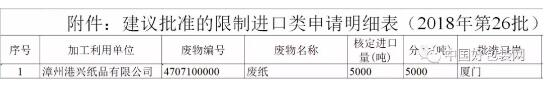 12月7日,第26批廢紙進口許可名單公示,僅有福建漳州港興紙業獲批,核定進口量為5000噸。