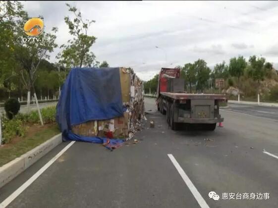 12月11日上午,泉州市惠安縣城至動車站快速通道上,一輛大掛車側(cè)翻,車上的幾十噸貨物傾倒在路中央,所幸事發(fā)時沒傷及其它過往車輛。 事故地點位于惠安縣城至動車站快速通道壩下村路段。記者到達(dá)現(xiàn)場時,大掛車已經(jīng)被吊起扶正,但象小山似的貨物還末清理,這些占據(jù)了近兩個車道的貨物是一些廢紙皮,前往惠安動車站和泉州方向的車輛只好減速慢行。大掛車司機介紹,車上裝載的廢紙皮有30多噸,打算從福州運往漳州一家造紙廠,清晨五點多,行駛到此處時,由于司機路況不熟,導(dǎo)致事故發(fā)生。  (記者):怎么側(cè)翻了? (大掛車司機陳師傅):就是那邊路面不平,有點溝,然后這樣打方向車子晃動,就翻了。 車子側(cè)翻后,陳師傅從車窗里爬出,所幸只是輕微受傷。他脫困后,一邊打電話給公司,一邊聯(lián)系救援車輛。上午九點多,大吊車來到現(xiàn)場,將大掛車吊起扶正,但由于車輛受損無法繼續(xù)行駛,只能等待公司派車來轉(zhuǎn)移貨物。據(jù)一旁的大吊車紀(jì)師傅介紹,這個路口彎太大,不熟悉路況的大貨車司機,一急打方向就容易發(fā)生側(cè)翻。
