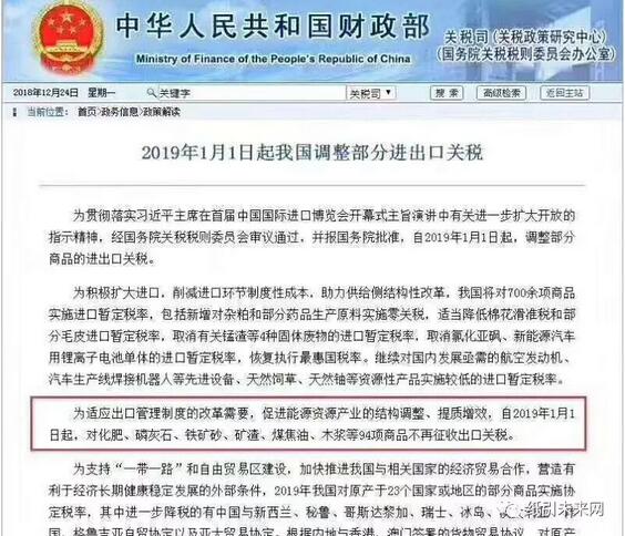 導語:國務院關稅稅則委員會發布關于2019年進出口暫定稅率等調整方案的通知。自2019年1月1日起對706項商品實施進口暫定稅率;自2019年7月1日起,取消14項信息技術產品進口暫定稅率,同時縮小1項進口暫定稅率適用范圍。其中,對化肥、磷灰石、鐵礦砂、礦渣、煤焦油、木漿等94項商品不再征收出口關稅。