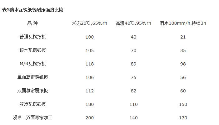 在冷鏈包裝和電商包裝中,要求最高的莫過于要求紙箱具備防水、防潮、保鮮等各種功能性用途。下面小編將為您介紹一些功能性瓦楞紙板的加工藝及用途。 1、疏水瓦楞紙板 又稱斥水瓦楞紙板,短時遭受水淋時,經過加工的紙板表面,使水成為水滴濺開,防止水滲入紙板內部。 一般疏水瓦楞紙板的加工方法是進行涂布加工,常用涂料有石蠟、有機硅、光油等疏水劑。光油粘度低滲透性好,但過多滲入紙張內部會降低疏水效果,因此涂刷光油前最好在紙板表面先刷一道淀粉漿,曬干成膜后再涂光油,效果較好。此外,因在造紙工藝的淀粉糊液中中加入適量耐水助劑,如脲醛樹脂、三聚氰胺甲醛樹脂、聚乙烯醇縮丁醛等能提高原紙的耐水性能。加工時即可將防水涂料直接涂在瓦楞紙板表面。 將石蠟涂在瓦楞紙板兩表面,瓦楞芯處采用噴霧涂布,這樣可獲得疏水性能較高的瓦楞紙板,其專利名稱為M/R瓦楞紙板。 疏水瓦楞紙板適合于包裝干燥粉狀物品,尤其是吸水后容易結塊的粉料,也適合于包裝經常進出冷庫的商品,從冷庫中取出后容易在箱壁結露,普通瓦楞紙板會迅速吸收而降低抗壓強度,造成紙箱受不了堆碼壓力而壓潰,經疏水加工后的紙板在露珠蒸發前不會顯著降低耐壓強度,能有效地保護商品。 2、遮水瓦楞紙板 又稱防水或擋水瓦楞紙板,其表面長時間地與水接觸幾乎不透水,但不能浸入水中,否則失去防水性能,結果類似于普通瓦楞紙板,這主要是與它的加工工藝有關。 遮水瓦楞紙板常用幕簾式涂覆法,即將熔融的合成樹脂或石蠟混合物從料斗口中成膜狀流下,涂覆在水平運行的瓦楞紙板上,紙板表面形成一層樹脂膜或蠟膜,具有良好的擋水性能。如有必要,在另一面如此循環覆膜一次,以獲得雙面防水性能。 遮水瓦楞紙板多用來包裝鹽腌制品、冷凍食品和果蔬類產品,由于瓦楞紙板表面有柔軟的石蠟層,故也適于包裝易擦傷的高光潔度家具、鋼琴、保險柜和精密機器等。 3、耐水瓦楞紙板 長時在水中浸泡后強度不明顯降低的瓦楞板紙稱為耐水瓦楞紙板。生產耐水瓦楞紙板有兩種設備和工藝,它的加工原理與浸漬加工類似。耐水瓦楞紙板可用儀器來測量其耐水度。所謂耐水度是將瓦楞紙板沒入水中(20±2℃自來水)30mm下,浸泡1h,然后測試其耐破度和邊壓強度,要求殘留強度應不低于標準強度(浸水前)的75%。耐水瓦楞紙箱用來裝運活魚、海產品和含水量極高的一類商品。 經防水加工后的瓦楞紙板,不僅具有良好的防水防潮性能,而且耐壓強度也有提高,下表列出了幾種防水瓦楞紙板與普通瓦楞在不同條件下的相對耐壓強度性能。