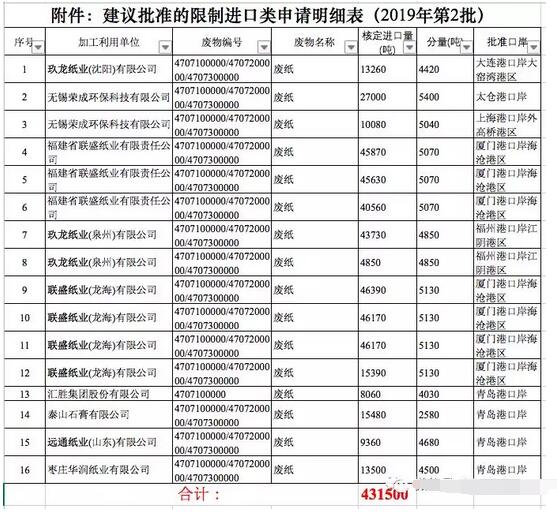 2018年12月29日,固廢中心公布的2019年第2批限制進口類申請明細表顯示,共通過廢紙核定進口總量為43.1500萬噸。