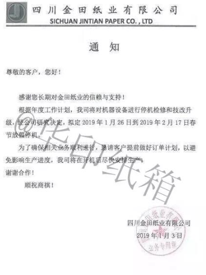 四川金田紙業、東莞金田紙業擬定于2019年1月26日開始春節停機檢修,四川金田紙業停機22天,東莞金田紙業停機29天。為確保相關業務的順利開展,請各紙箱廠提前做好訂單計劃!
