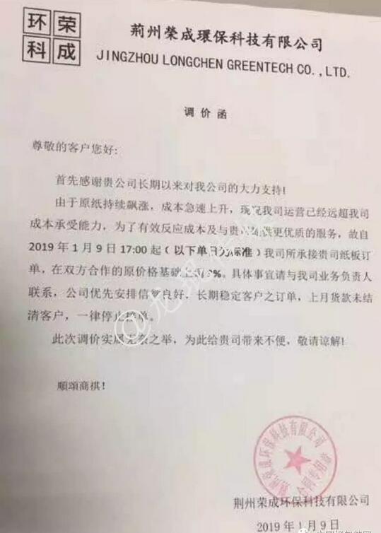 武漢龍發(fā)包裝有限公司 自2019年1月7日17:00接單起,紙板價(jià)格在現(xiàn)有基礎(chǔ)上上調(diào)5%。