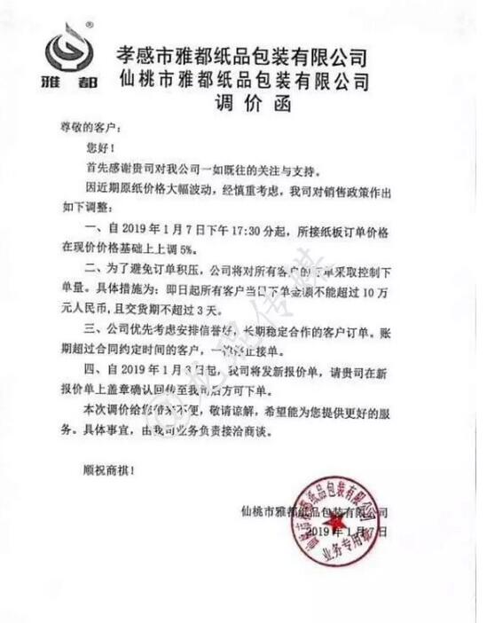 孝感市雅都紙品包裝有限公司/仙桃市雅都紙品包裝有限公司 自2019年1月7日17:30下單起,紙板訂單在現(xiàn)有基礎(chǔ)上上調(diào)5%。即日起所有客戶當(dāng)日下單金額不能超過(guò)10萬(wàn)元人民幣,且交貨期不超過(guò)3天。