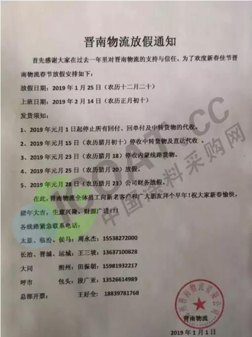 物流公司發春節停運通知,最早1月10日停收,2019放假時間提前 年關將近,很多物流公司都陸續發布了2019年春節停運通知。 據了解,大部分物流公司從1月20日起開始放假,部分甚至在1月10日、12日就停止收貨,節后2月12日左右開始正常運輸。 2019年春節放假時間較2018年春節放假時間有所提前。 部分物流停運通知: