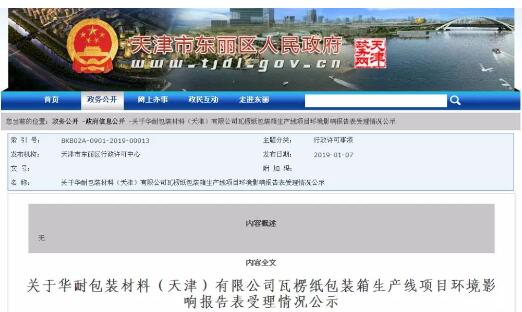 導(dǎo)語:華耐包裝材料(天津)有限公司投資150萬元進(jìn)行建設(shè)的瓦楞紙包裝箱生產(chǎn)線項目已進(jìn)入環(huán)評階段,預(yù)計2019年2月投產(chǎn),其中環(huán)保投資28萬元,項目建成后,預(yù)計年生產(chǎn)紙制品300萬立方米。