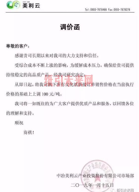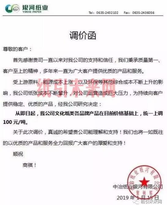 山東天和紙業(yè)有限公司:近期我公司持續(xù)受原材料、能源等多種因素影響,生產成本升幅較大,為確保貴我雙方互共贏,產品品質持續(xù)穩(wěn)定,經公司董事會研究決定:自2019年1月13目起,我司生產的低定量文化用紙:本白雙面膠版印刷紙及薄冊紙在原價格上調100元/噸,高白和深黃的雙面膠版及薄冊紙在原價格上調200元/噸。