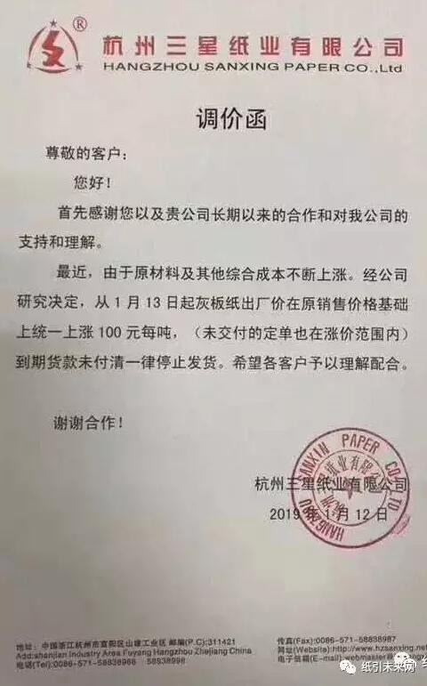 廣東松煬再生資源股份有限公司:由于目前原材料不斷漲價造成我司生產成本均在大幅攀升,為了保證產品質量,經公司協(xié)商決定價格調整如下:1.從2019年1月13日起,我司生產的美陽牌灰底涂布白板紙在原有價格基礎上上調50元/噸。2.所有未完成訂單(包括此前預付款未完成的訂單)都在此上調范圍內。