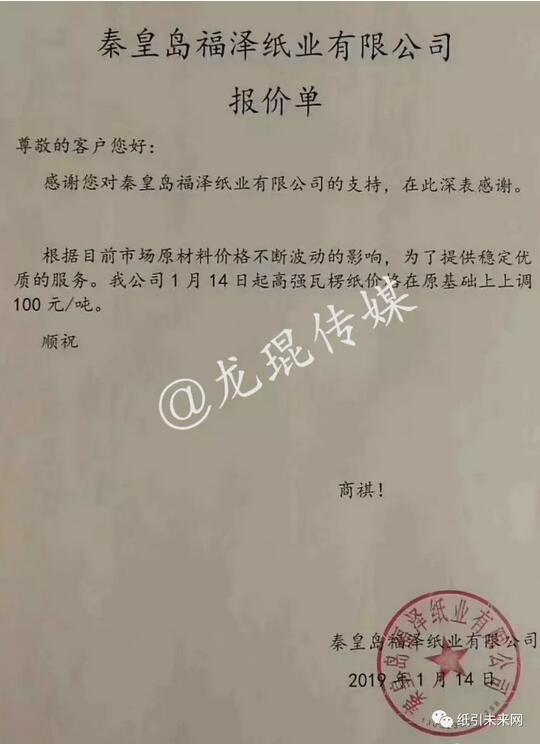 秦皇島撫寧縣豐滿紙板有限公司:從2019年1月14日起,高強瓦楞紙價格上調100元/噸。