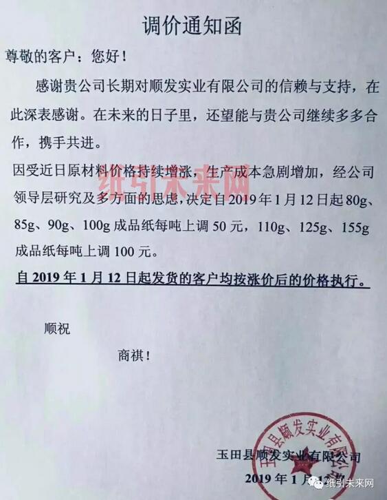1月12日,玉田縣順發(fā)實業(yè)有限公司發(fā)布漲價函:1月12日起,80g、85g、90g、100g成品紙每噸上調50元,110g、125g、155g成品紙每噸上調100元。