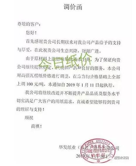 上海太古清風實業(yè)有限公司:自2019年1月14日零點起,所有紙板訂單單價在原價格的基礎上上調2%,且所有特價全部取消。節(jié)前接單截止日期為1月24日,年后2月14日開機生產。