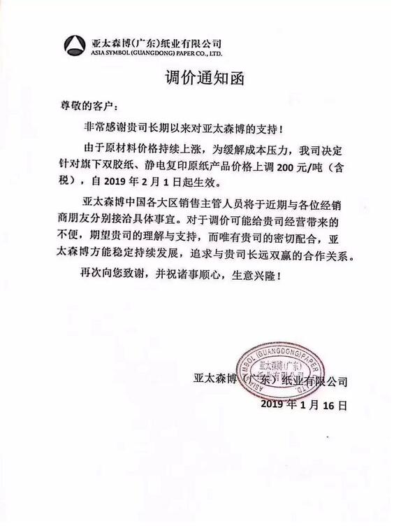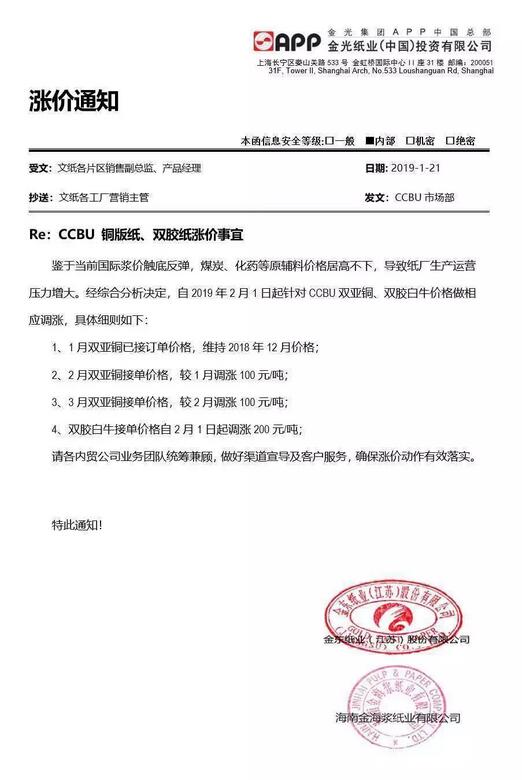 1月19日,闊葉漿價出現跳漲異動,1月中下旬,市場依舊平淡,但漲價函頻現,白卡、包裝紙和文化紙市場均有漲價函出現,淡季啟動漲價,可以判斷行業對春節后的價格反彈行情有所期待,淡季喊漲預熱,節后尚看供求。