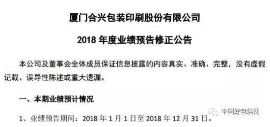 1月30日晚間,合興包裝發布了《2018年度業績預告修正公告》,調整了2018年1月1日至2018年12月31日期間的業績預期。