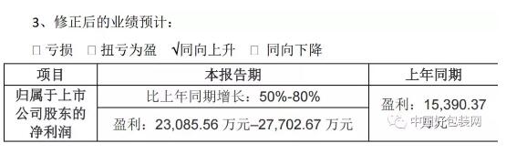 而在最新的公告中,合興包裝表示,2018年度歸屬于上市公司股東的凈利潤變動幅度為50%-80%,凈利潤變動區間為:23,085.56萬元–27,702.67萬元。