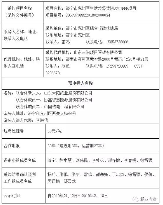 2月11日,中國政府采購網(wǎng)發(fā)布濟(jì)寧市兗州區(qū)生活垃圾焚燒發(fā)電PPP項(xiàng)目預(yù)中標(biāo)公示。公示顯示,預(yù)中標(biāo)人名稱為:山東太陽紙業(yè)股份有限公司(聯(lián)合體牽頭人)、協(xié)鑫智慧能源股份有限公司(聯(lián)合體成員一)和中國核電工程有限公司(聯(lián)合體成員二)。預(yù)中標(biāo)的垃圾處理費(fèi)為一噸60元,合作期限為30年(建設(shè)期3年,運(yùn)營期27年)。