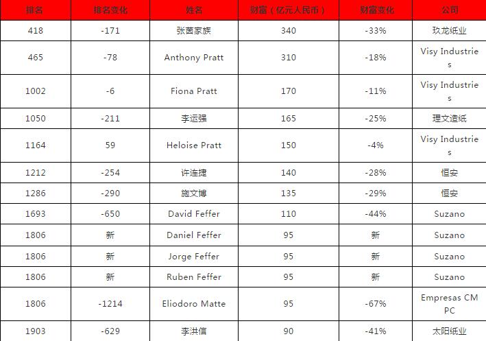 在榜單中,全球造紙行業(yè)共有13人(家族)入榜。玖龍紙業(yè)張茵家族以340億人民幣位列全球第418位,財(cái)富較2018年縮水130億人民幣,蟬聯(lián)造紙行業(yè)第一名。澳大利亞回收、造紙及包裝業(yè)務(wù)的Visy集團(tuán)AnthonyPratt和他妹妹FionaPratt列造紙行業(yè)第二、第三名。除三位新入選的富豪外,其余9位(家族)富豪的財(cái)富較2018年都有所減少。