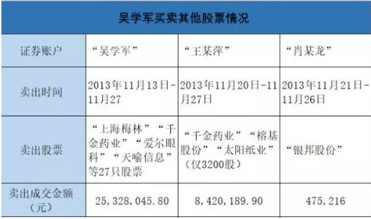 此外,“太陽紙業”買入金額占同期賬戶可使用資金總額比例較大。“余盛”賬戶買入金額占比99.9%,“星月投資”賬戶買入金額占比99.89%,“周某英”賬戶買金額占比9.57%。 與余盛類似,吳學軍賬戶組自開戶以來未交易過“太陽紙業”。與朱某、單某軍第一次見面后,吳學軍從2013年11月13日至11月26日大量買入“太陽紙業”共755.08萬股,成交金額3876.5萬元,僅賣出5.83萬股,成交金額29.8萬元5.83萬股,成交金額29.8萬元。 11月26日吳學軍與朱某、單某軍第二次見面后,11月27日,吳學軍操作王某萍及其本人賬戶又買入“太陽紙業”35.98萬股,買入金額194.58萬元。吳學軍賬戶組于2013年11月13日至11月27日合計買入“太陽紙業”的成交金額,占吳學軍賬戶組“太陽紙業”總買入量的92.39%。 在內幕信息公開前,吳學軍賬戶組于2013年11月13日至12月11日(復牌日)僅賣出5.83萬股,金額29.8萬元,其他均是在內幕信息公開后賣出。 吳學軍賬戶組買入“太陽紙業”相比其他股票的金額放大。與朱某、單某軍接觸后,從2013年11月13日至11月27日,吳學軍賬戶組買入“太陽紙業”791.06萬股,合計4071.08萬元,是該時期吳學軍賬戶組買入金額最大的股票。 除在買入金額中占比較大外,“太陽紙業”買入金額占同期賬戶可使用資金總額比例也較大。吳學軍賬戶組買入“太陽紙業”金額占同期賬戶可使用資金金額的79.23%。 值得一提的是,吳學軍賬戶組也出現賣出其他股票買入“太陽紙業”的異常情況。