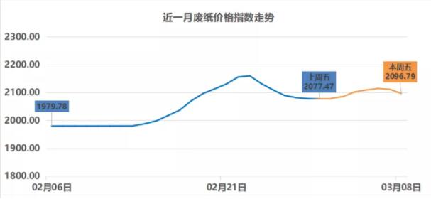 上周廢紙價格指數先漲后跌,但整體來說走勢相對較為平緩,廢紙價格單次漲跌幅度多在50元/噸之內。截止03月08日,廢紙價格指數從最高值回落至2096.79點。 1、山鷹系A級收購價格走勢