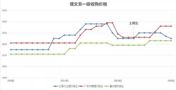 上周理文系一級紙收購價格對比上周五略有上漲。其中東莞理文一級紙在本周上漲了100元/噸,重慶理文上漲了40元/噸,江西理文則與3月1日價格持平。 截止3月8日,理文系一級紙以東莞理文最高,為2360元/噸;重慶理文最低,為2230元/噸。 3、玖龍系A級收購價格走勢