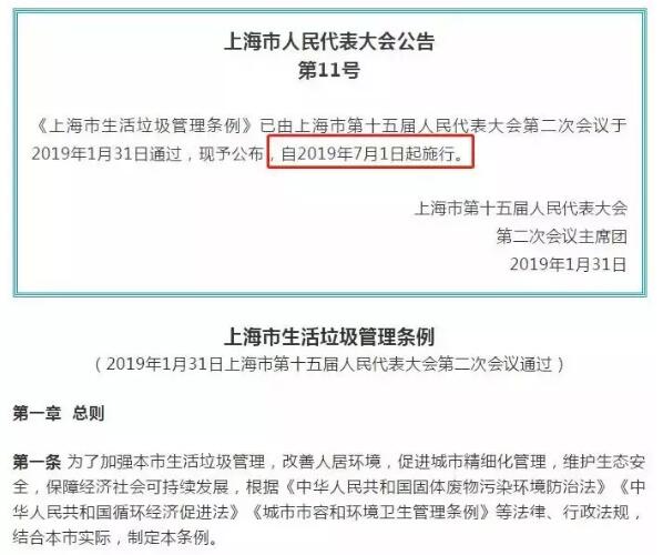 2019年1月下旬,國務院辦公廳發布了《“無廢城市”建設試點工作方案》,部署開展“無廢城市”建設試點工作,重點推進固廢源頭處理的減量和資源化利用,最大限度地減少填埋量,而“46城”垃圾分類強制試點也將全面開啟,由此將催生出“固廢處理”背后的數萬億元處置市場前景。 近來,不少城市出臺了垃圾分類明確的剛性約束和制度規范。 1、上海:強制垃圾分類,7月1日起正式實施 2019年1月31日,上海市十五屆人大二次會議表決通過《上海市生活垃圾管理條例》(以下簡稱《條例》),并將于7月1日正式開始實施。