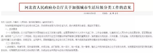 此舉標志著,在推行20多年后,“垃圾分類”在申城納入法治框架:個人混合投放垃圾,今后最高可罰200元;單位混裝混運,最高則可罰5萬元。 屆時,上海黨政機關內部辦公場所不得使用一次性杯具,旅館不得主動提供一次性日用品,餐館、外賣不得主動提供一次性餐具。 2、河北:6年建成垃圾分類“無廢城市” 4月1日,河北省人民政府辦公廳出臺《關于加強城市生活垃圾分類工作的意見》。意見指出,河北省將加快建設分類投放、分類收集、分類運輸、分類處理的垃圾處理系統。其中,雄安新區要建立具有國際先進水平的生活垃圾強制分類制度,按照“無廢城市”標準規范做好規劃設計和建設。