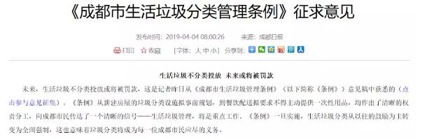 2019年底前 各市全面啟動生活垃圾分類工作,分別建成5個以上生活垃圾分類示范單位和示范社區。 2020年底前 各市公共機構垃圾分類覆蓋率達到50%以上,相關企業和居民社區垃圾分類覆蓋率達到30%以上。石家莊、邯鄲市作為首批國家垃圾分類試點城市,張家口市作為2022年冬奧會協辦城市,應于2020年底前基本建成生活垃圾分類處理系統。 2022年底前 各市公共機構垃圾分類覆蓋率達到75%以上,相關企業和居民社區垃圾分類覆蓋率達到50%以上。 2025年底前 生活垃圾回收利用率達到35%以上,基本建成生活垃圾分類處理系統。 3、成都:全面強制垃圾分類,最高罰款10萬 4月2日,成都市政府官網立法征集板塊公開了《成都市生活垃圾管理條例》。 1、可回收物應當交售給再生資源回收站點、回收經營者,或者投放至可回收物收集容器、收集點; 2、有害垃圾應當交給有害垃圾回收站點,或者投放至有害垃圾收集容器; 3、餐廚垃圾應當投放至餐廚垃圾收集容器; 4、其他垃圾應當投放至其他垃圾收集容器。