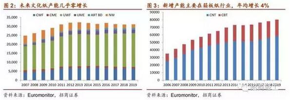 基于2019年新增產(chǎn)能計(jì)劃,從下圖來看,未來2年新增產(chǎn)能主要是箱板紙,2017年5000萬噸達(dá)到2019年5600萬噸左右,過去3年箱板紙行業(yè)需求增長一般維持在2~3%左右,其中最大的推動(dòng)因素是快遞行業(yè)。我們認(rèn)為,造紙行業(yè)整體供需格局依然穩(wěn)健,供應(yīng)壓力主要體現(xiàn)在包裝紙行業(yè)上,而文化紙行業(yè)新增產(chǎn)能幾乎為零,如果假設(shè)未來紙品需求依然穩(wěn)健,未來造紙行業(yè)供需壓力無須過于擔(dān)心。
