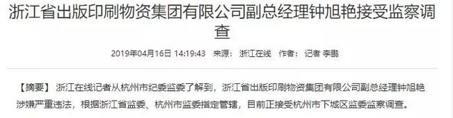 引言:第一輪反腐掃到印刷領域,浙江省出版印刷物資集團有限公司副總經理鐘旭艷涉嫌嚴重違法,被杭州市下城區監委監察調查。