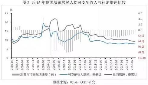 與此同時,數據還顯示,可支配收入增速的變動與消費增長變動同向,2013年至2018年,我國可支配收入增速逐步回落的同時社消增速也呈現回落趨勢。