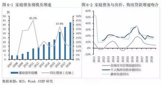 截至2018年末,我國家庭債務超過43萬億(約為可支配收入90%),過去十年復合增速約為23%。數據顯示,家庭債務與房價、個人購房貸款余額增速呈正相關,可見家庭債務的快速增長主要是由于過去十年中房價暴漲引起的居民購房貸款增加所致。目前我國個人購房貸款余額為25.75萬億,占家庭債務總規模的約六成。