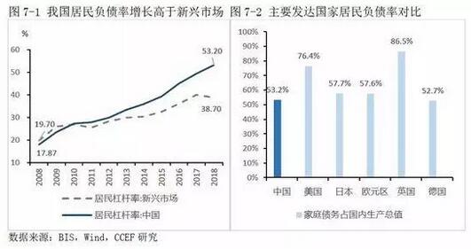 截至2018年末,居民負債率達到53.2%,比新興市場國家平均水平高出15個百分點。接近部分發達國家水平,但考慮到我國社會保障體系的完善程度遠遠低于發達國家,居民仍然需依靠自身儲蓄養老,我國目前的負債水平上偏高的,甚至已超過部分發達國家。因此,國內居民消費前景不容樂觀。
