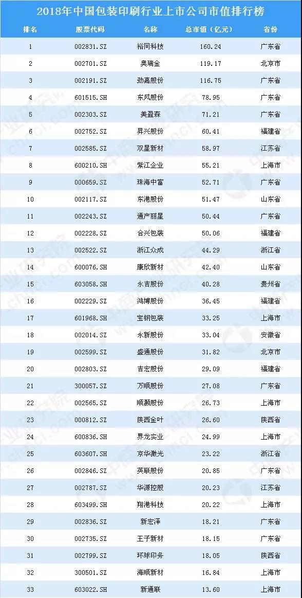 圖片來源:同花順 截止到2018年12月28日,2018年中國包裝印刷行業(yè)上市公司總市值排名前十的企業(yè)有:裕同科技、奧瑞金、勁嘉股份、東風(fēng)股份、美盈森、昇興股份、雙星新材、紫江企業(yè)、珠海中富、東港股份。