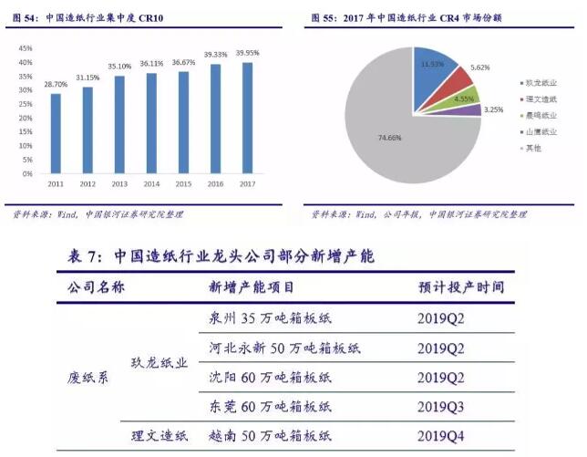 從行業整體的產銷量數據來看,經過2010年以來的環保政策去產能之后,造紙行業的CR10從2011年的28.70%逐步上升到2017年的39.95%,而美國造紙行業在經歷環保立法去產能及行業并購之后,CR10已經達到了90%左右。從按照各公司披露的銷量數據計算的CR4數據來看,玖龍紙業、理文造紙、太陽紙業、晨鳴紙業四家龍頭企業2017年所占的市場份額僅為25.34%,而美國造紙行業在1972年的CR4為24%,經過“十年環保立法”后的1984年的CR4達到29%。經過環保去產能,部分中小落后產能被淘汰,行業集中度有所提升,而隨著行業龍頭逐漸開始擴產能,我們認為造紙行業的集中度有望進一步提升。從中國造紙行業現階段集中度及行業龍頭擴產能狀態來看,中國造紙行業目前正處于行業去產能的中后期——環保立法會進一步淘汰行業落后產能,符合環保標準的行業龍頭開始擴產能提升市場份額。
