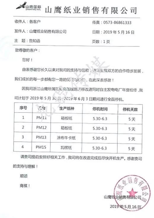 東莞中聯紙業:由于電廠鍋爐設備故障,現于5月29日早上8:00對全廠機臺進行停機檢修,開機時間另行通知。