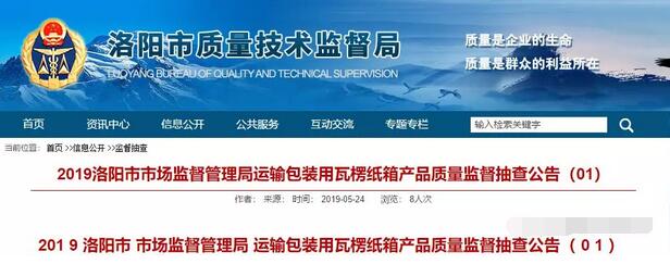 近日,洛陽(yáng)市市場(chǎng)監(jiān)督管理局發(fā)布抽查公告稱(chēng),洛陽(yáng)市質(zhì)量技術(shù)監(jiān)督檢驗(yàn)測(cè)試中心于2019年第1季度,對(duì)全市范圍內(nèi)運(yùn)輸包裝用瓦楞紙箱生產(chǎn)企業(yè)進(jìn)行市監(jiān)督檢查。