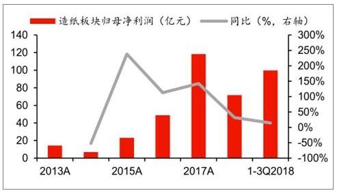 2018年中國造紙行業市場概況 供給端,2018年下半年開始行業新增產能投產增多,預計2018-2019年整體新增產能在1400萬噸;需求端,與宏觀經濟關聯性較高的包裝紙、銅版紙需求或將承壓,供需格局預計在2019年將有所惡化,供需關系從緊平衡轉向供給過剩。 至2018年9月底造紙板塊累計固定資產投資完成額達到2137萬元,累計同比增長5.8%,較2017年底1.2%的同比增速有顯著回升。 2018年前三季度造紙板塊實現營收1079億元,同比增長17%;實現歸母凈利潤100億元,同比增長14%。三季度旺季需求不及預期,成品紙價格出現回調,同時原材料價格高位震蕩,Q3單季板塊營收增速回落至7%,歸母凈利增速下滑至-0.2%。 2013-2018年前三季度中國造紙板塊營業收入、歸母凈利潤統計及增長情況
