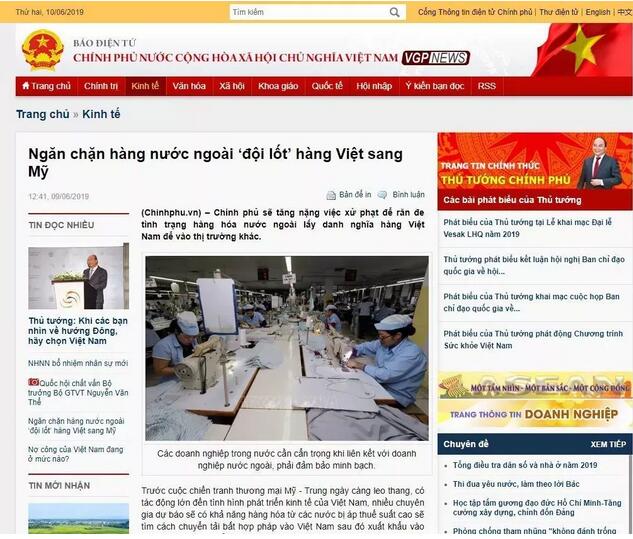 圖|越南政府門戶網站 英國路透社10日引述越南海關前一天發表的聲明稱,該部門已在中美貿易爭端持續期間發現幾十起中國產品通過“原產地造假”和“非法轉運”活動,以躲避美國對中國產品加征的關稅。 越南海關稱將對此類行為進行嚴查并重罰。美國彭博社6月10日稱,自美中貿易緊張今年升級以來,越南對美出口正在激增。盡管有證據顯示其中一些增量歸功于供給鏈向越南轉移,但分析人士對這些激增到底在多大程度上屬于合法出口提出疑問。 越南海關在聲明中稱,原產地造假和非法轉運商品大多發生在紡織品、海鮮、農產品、瓷磚、蜂蜜、鋼鐵、鋁和木制品等行業。 越南政府發現的欺詐案例包括中國產品的包裝被改為“越南制造”,偽造原產地證書,再出口到美國。聲明援引的一個例子是,美國海關近期發現一家越南企業售往美國的“越南產”膠合板實際為中國產。 越南國會經濟委員會常務委員Do Van Sinh說,允許被虛假貼牌的中國產品流入美國,越南可能遭到美國懲罰。聲明稱,越南海關正在制定一種能更好地識別并懲罰有關違規企業的程序。 就在上個月,美國財政部將越南列入“匯率操縱國”的觀察名單,換句話說,越南或許已經受到美國的嚴格審查。 越南是迄今為止中美貿易戰最大的贏家 根據美國人口普查局最新數據顯示,今年第一季度,越南對美出口同比激增40.2%。其對美出口總額將有望超越意大利、法國、英國和印度等經濟體。