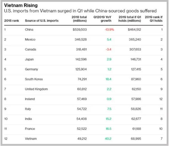 在貿易戰背景下,今年第一季度中國對美出口下降13.9%;上月包括日本、韓國、新加坡和臺灣等區域主要經濟體對美出口也都出現下滑,而越南上月對美出口同比增長7.5%。 彭博社分析指出,受美國對中國加征關稅影響,許多企業紛紛將供應鏈轉移到越南,越南本身也具備勞動力成本低、營商氣氛不斷改善的優勢,這些都成為促進越南經濟增長的積極因素。