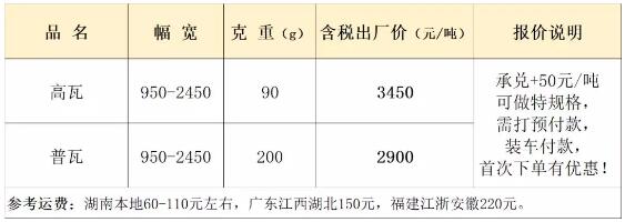 國產原紙:6月15日報價 衡山新金龍紙業: 高瓦110克:3250元/噸 高瓦120-140克:3150元/噸 紗管紙F200:3150元/噸 紗管紙F300:3350元/噸 說明: 高瓦門幅4600,紗管紙門幅4800,以上報價為含稅出廠價,不收承兌,可按需采購。裝車付款,量大價優。 參考運費: 湖南本地60-110元左右, 廣東江西湖北150左右,福建江浙安徽220元左右。 瀏陽永泰紙業: 高瓦90克:3450元 普瓦200克:2900元 說明: 門幅950-2450,以上報價為含稅出廠價,承兌加50,可以做特規格,需打預付款。裝車付款,首次下單有優惠。 參考運費: 湖南本地50-100元左右, 廣東江西湖北140左右,福建江浙安徽210元左右。裝車付款,首次下單有優惠。 國產原紙:6月14日報價 衡山新金龍紙業: 高瓦110克:3250元/噸 高瓦120-140克:3150元/噸 紗管紙F200:3150元/噸 紗管紙F300:3350元/噸 說明: 以上為含稅出廠現金價(不收承兌)。 運費: 湖南本地60-110元左右, 廣東江西湖北150左右,福建江浙安徽220元左右。裝車付款,量大價優! 河北 國產原紙:6月17日報價 華興紙業: 箱板紙120-140g:3150元 箱板紙150-160g:3100元 高強瓦楞紙110g:3150元 高強瓦楞紙120-140g:3100元 說明: 箱板紙幅寬5300,高瓦幅寬4400,以上報價為含稅出廠價,不收承兌。 參考運費: 河北本地30-150元,山東70-150,江蘇長三角160-250,浙江230-400,安徽160-300,湖南300-400,湖北200-300,河南90-160。 內蒙古 國產原紙:6月16日報價 內蒙古運籌工貿: