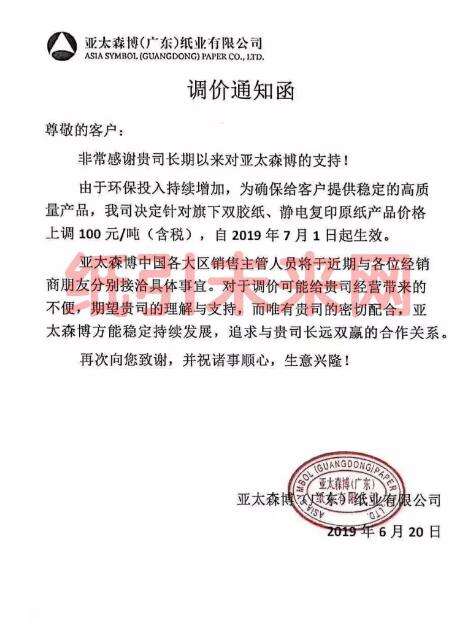 亞太森博:由于環保投入持續增加,為確保給客戶提供穩定的高質量產品,我司決定針對旗下雙膠紙、靜電復印原紙產品價格上調100元/噸(含稅),自2019年7月1日起生效。