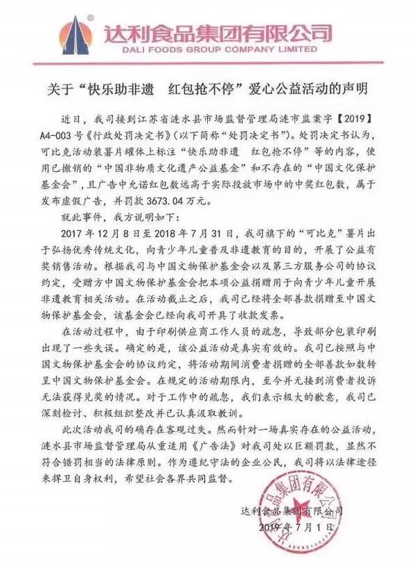 是公益活動還是一場騙局? 達利集團涉嫌虛假廣告宣傳 “快樂助非遺,紅包搶不停”。在2017年12月8日至2018年7月31日,達利集團可比克活動裝薯片開展了一次公益捐贈行動,上述10個字的助力非遺行動的口號即標注在罐體上,該活動內容介紹也很詳細:活動期間,凡購買可比克活動裝薯片,開蓋掃描封口內二維碼,即有機會獲得微信紅包1個或電子獎券,并可參與助力非遺公益活動及集卡活動,獲取其他禮品。消費者掃碼獲得現金紅包后,可選擇提現或助達利食品集團進行捐贈,還可點亮文化遺產項目來參與宣傳、傳播活動。消費者選擇助達利食品集團進行捐助的金額,將由達利食品集團全部捐贈給中國文化保護基金會,用于面向青少年開展非遺教育相關活動。該活動時間是“即日起至2018年7月31日”。 另外一款來自可比克黃色罐裝的薯片包裝殼上的文字則宣稱:達利食品集團將聯合中國非物質文化遺產公益基金發起“快樂助非遺,紅包搶不停”公益行動,該活動時間是“即日起至2018年5月31日”。 可以注意到,達利集團文中宣稱的聯合活動方包括“中國非物質文化遺產公益基金”和“中國文化保護基金會”。 本以為活動到期結束,產品將下架,但在之后根據江蘇省漣水縣市場監督管理局之后開展的調查中,上述活動過期后卻依然宣傳,執法人員在市場上還發現生產日期為“2018年8月6日”的可比克活罐裝薯片,其罐身依然是助力非遺活動宣傳的包裝。 漣水縣市場監督管理局經過前期8個多月輾轉多地深入調查,“中國文化保護基金會”根本不存在,而另一個“中國非物質文化遺產公益基金”早在2011年下半年就撤銷了。對此,漣水縣市場監督管理局認定達利集團存在以已撤銷的“中國非物質文化遺產公益基金”、不存在的“中國文化保護基金會”和實際紅包數遠低于允諾的紅包數發布虛假廣告。 對此,中華社會文化發展基金會在2018年11月5日也給漣水縣市場監督管理局出具“情況說明”并同時澄清:從未與達利食品集團進行過任何合作。 除上述虛假宣傳外,漣水縣市場監督管理局還發現,達利集團廣告宣傳的中獎紅包和紅包中獎率同樣涉嫌虛假廣告宣傳。 在活動裝薯片的罐身上,關于獎項設置非常明確地寫著:本次中獎紅包總數量為1.45億個,紅包中獎率為36%,獎項共設置7種,一等獎2888個,獎金1888元;二等獎1.888萬個,獎金108元…… 按36%的中獎率和紅包總數1.45億個計算,活動期間產品市場投放的總量應該超過4億個可比克薯片罐體。但是,據漣水縣市場監督管理局調查統計,達利食品集團投放在市場的活動產品總數僅9000多萬個(罐)。 對此,漣水縣市場監督管理局認為:實際的紅包數量遠低于允諾的紅包數量,而且廣告宣傳的2個公益組織目前均不存在,這屬于虛假廣告,嚴重違反了《中華人民共和國廣告法》相關規定。 依據《中華人民共和國廣告法》第四條規定:廣告不得含有虛假或者引人誤解的內容,不得欺騙、誤導消費者。廣告主應當對廣告內容的真實性負責。第二十八條規定:廣告以虛假或者引人誤解的內容欺騙、誤導消費者的,構成虛假廣告。廣告有下列情形之一的,為虛假廣告,其中第(二)項:商品的性能、功能、產地、用途、質量、規格、成分、價格、生產者、有效期限、銷售狀況、曾獲榮譽等信息,或者服務的內容、提供者、形式、質量、價格、銷售狀況、曾獲榮譽等信息,以及與商品或者服務有關的允諾等信息與實際情況不符,對購買行為有實質性影響的。 6月17日,漣水縣市場監管局下達行政處罰決定書,決定對達利食品集團處以3673.04萬元罰款,上繳國庫。 達利不認罰:將以法律途徑捍衛自身權利 達利集團進行的到底是公益活動還是一場騙局?達利集團方面是否有針對進行善款的捐贈? 對此,在7月1日每日經濟新聞(微信號:nbdnews)記者收到的達利集團方面的官方回復中,達利集團指出,“公益活動真實有效”“在活動結束后,已經將全部善款捐贈到中國文物保護基金會。” 對此,記者登錄中國文物(達利的活動表述中為“文化”)保護基金會官網瀏覽后發現,達利集團方面的確在2018年8月1日以“快樂助非遺”項目的名義向中國文物保護基金會捐贈10萬元。 這也意味著達利集團真正捐到的是“中國文物保護基金會”,而罐身上宣傳的是“中國文化保護基金會”,一字之差背后被開出天價罰單,達利對于這樣的紕漏如何解釋? 在達利的官方回應中顯示,“在活動過程中,由于印刷供應商工作人員的疏忽,導致包裝印刷出現了一些失誤。但此次公益銷售活動是真實有效的。我司已完全、如期地履行協議約定,不存在任何虛假行為,受贈方中國文物保護基金會也按時拿到了善款。” 達利集團還指出,“在規定的活動期限內,至今并無接到消費者投訴無法獲得兌獎的情況。” “詐捐門”背后有無烏龍? 對于工作中的疏忽,達利集團一方面在表示已深刻檢討、積極組織整改并已認真汲取教訓的同時,達利集團對于這份巨額罰單還存有異議。 “此次活動我司的確存在客觀過失。然而,針對一場真實存在的公益活動,漣水縣市場監督管理局從重適用《廣告法》對我司處以巨額罰款,顯然不符合錯罰相當的法律原則。”達利集團表示,“我們將尋求以法律途徑來捍衛自身權利。” “看起來是一場由于供應商工作人員犯下的低級錯誤,但這么一場大型的活動,達利方面就沒有專業的市場
