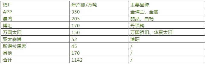 作為高端包裝紙的白卡紙,需求一直相對穩定。近年來白卡紙的年均增速在5%~7%之間,細化到品類品種里面:例如食品卡增速已經超過了10%,因此各紙廠為穩定市場份額和開發新的利潤增長點,紛紛開始新上項目。但是,2018年白卡紙價格卻全年下跌了28%,白卡紙未來市場前景究竟會怎樣? 一、國內產能分析 1、現有產能 白卡紙現有產能表