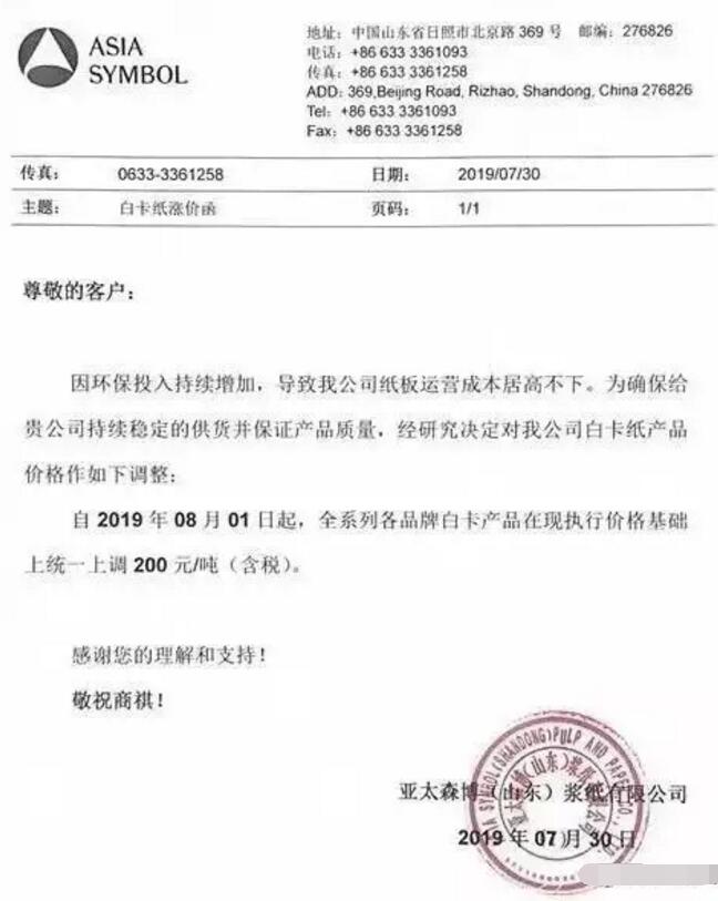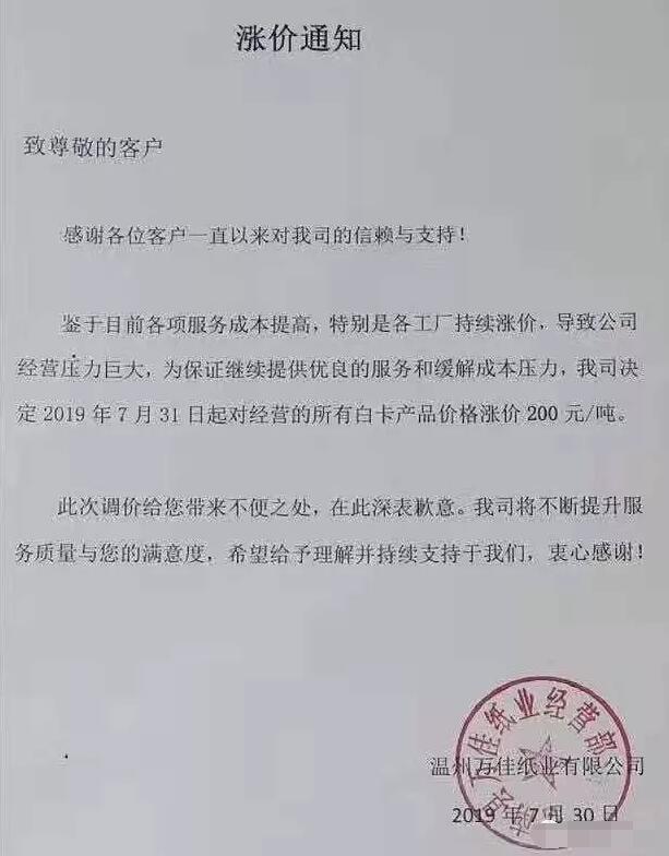 蒼南縣永興紙業:鑒于目前各項服務成本提高,特別是各工廠持續漲價,決定2019年7月31日起對經營的所有白卡產品價格漲價200元/噸。