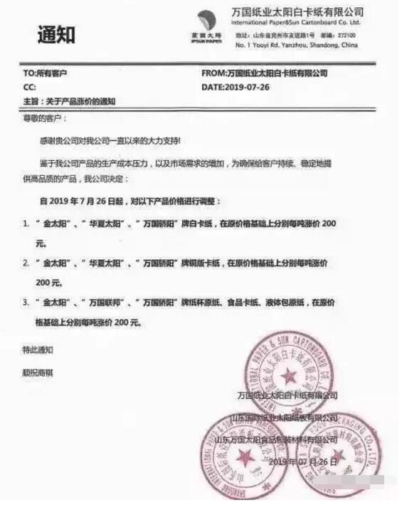 萬國紙業:鑒于我公司產品的生產成本壓力,以及市場需求的增加,為確保給客戶持續,穩定地提供高品質的產品,我公司決定:自2019年7月26日起,對以下產品價格進行調整:1、“金太陽”、“華夏太陽”、“萬國驕陽”牌白卡紙,在原價格基礎上分別每噸漲價200元。2、“金太陽”、“華夏太陽”、“萬國驕陽”牌銅版卡紙,在原價格基礎上分別每噸漲價200元。3、“金太陽”、“萬國聯邦”、“萬國驕陽”牌紙杯原紙、食品卡紙、液體包原紙,在原價格基礎上每噸漲價200元。