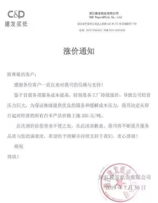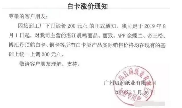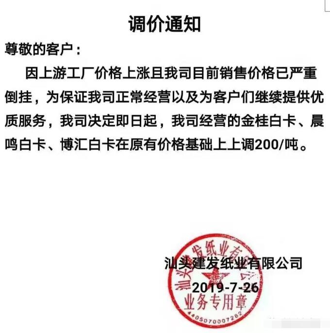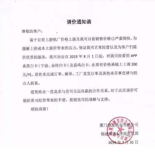 廈門建發:自2019年8月1日起,對我司經營的APP系類白卡(寧波、金桂白卡)及晨鳴白卡,在原有價格基礎上上調200元/噸。原有未完成訂單、新單、工廠直發訂單及其他未盡事宜請與經辦人聯系。
