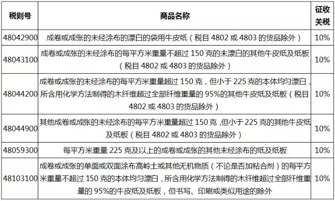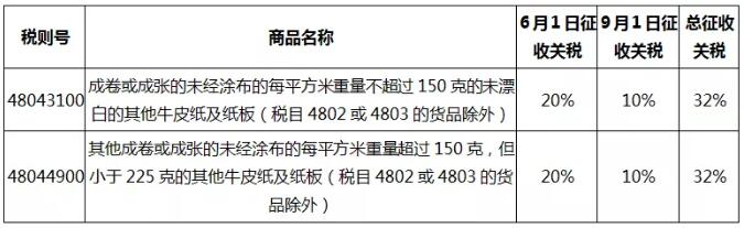 此外,9月1日及12月15日加征關(guān)稅的名單中,還涉及與6月1日重復(fù)加稅的48043100和48044900兩個稅則號。兩個稅則號6月份關(guān)稅為20%,9月份加征關(guān)稅10%,總關(guān)稅為32%。
