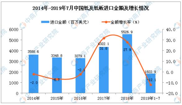 2019年1-7月中國紙及紙板進口數量及金額增長率情況